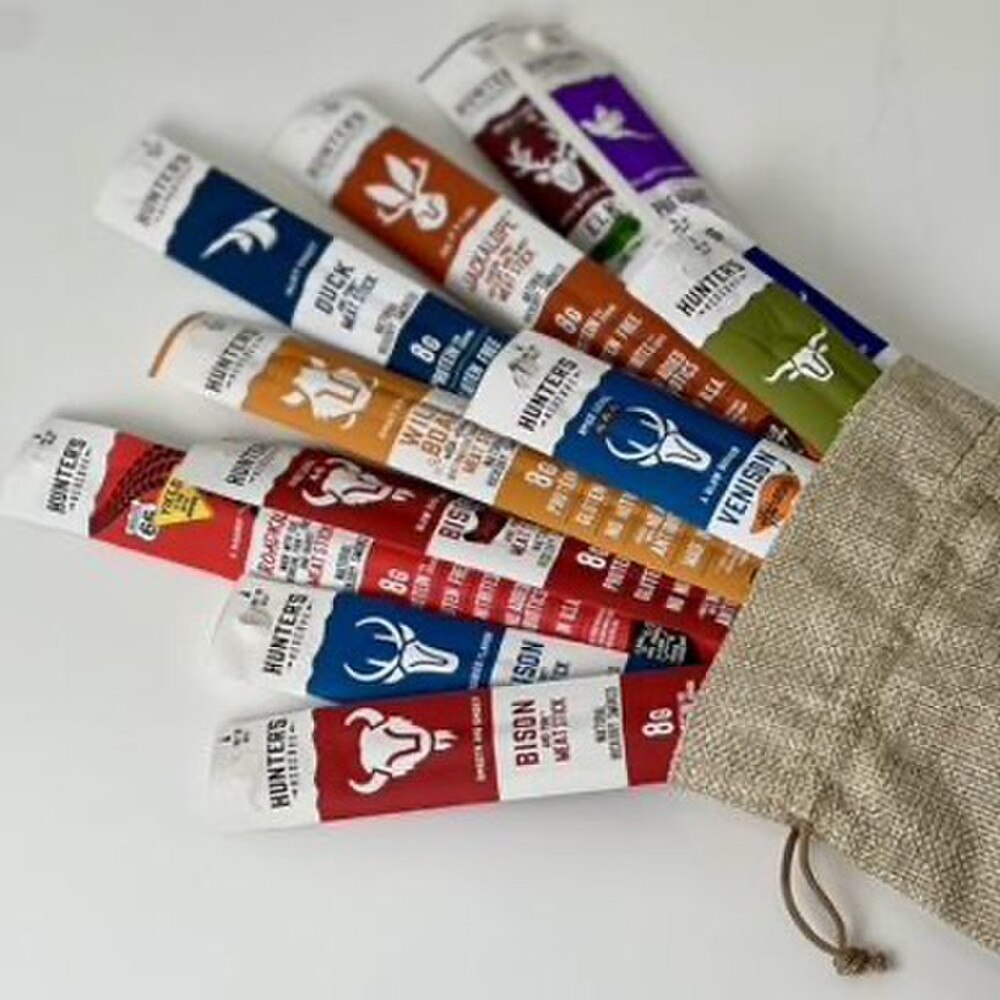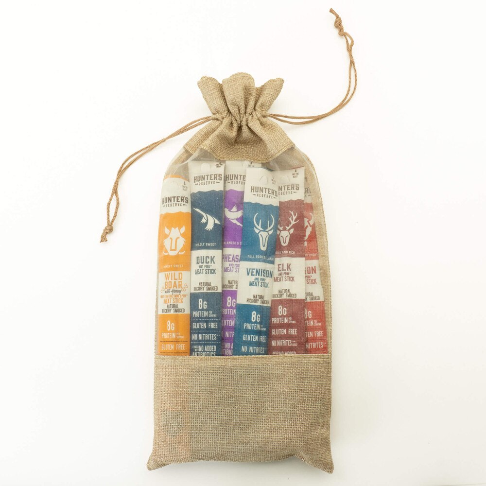 Embark on a bold flavor adventure with the Adventurer's Dozen, a curated selection of twelve premium exotic meat sticks. Packed in a rustic burlap sack, this collection brings together the finest wild game meats, each expertly crafted for a rich and satisfying snacking experience. Whether you're fueling up for the outdoors, expanding your palate, or gifting a fellow adventurer, the Adventurer's Dozen delivers a taste of the wild in every bite.