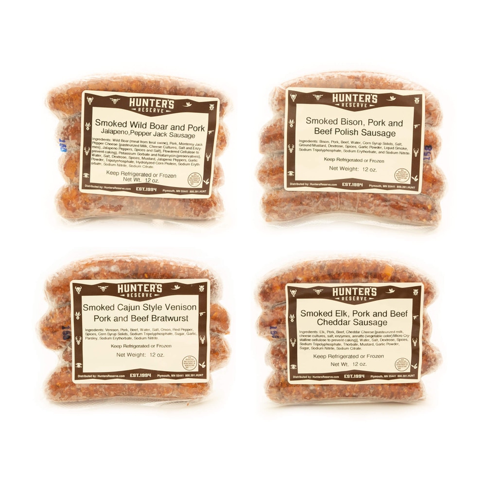 Indulge in a gourmet bratwurst feast with our bundle of 4 each of Bison, Elk, Wild Boar, and Venison Brats. Carefully crafted by Hunters Reserve, this collection offers a delicious variety of bratwurst made from lean and flavorful meats. Elevate your grilling game with these unique and savory options.